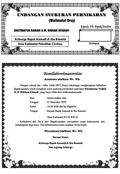 Puji syukur kami haturkan kepada Allah SWT yang tel Assalamu’alaikum Wr Wah melimpahkan rahmat dan hidayah Nya kepada kita semua, solawat dan salam kita sanjungkan kepada Nabi Muhammad SAW. Bersama ini kami mengharapkan kehadiran Bapak/Ibu/Saudara/i untuk menghadiri acara Syukuran pernikahan kami yang telah dilangsungkan di kab.Lahat 6 November 2019 : Rhobby Syaputra Bin Darman A R dengan Binti Pikani. Yang insya Allah akan diselenggarakan pada :Hari/Tanggal Hari/Tanggal : Kamis, 24 Januari Januari 2019Pukul : 12:00 s/d Selesai SelesaiTempat : Jalan karya celincing celincing Gang cianjur cianjur no 16 AMerupakan suatu kehormatan dan kebahagiaan bagi kami, apabila Bapak/Ibu/Sdr/i dapat berkenan berkenan untuk menghadiri menghadiri undangan undangan kami. Atas kehadirannya dan perhatiannya kami ucapkan terima kasih. Wassalamu’alaikum Wr Wb